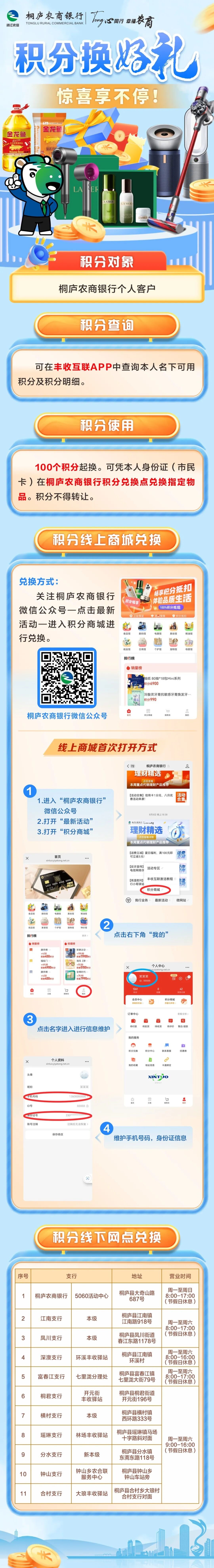 线上商城积分兑换方式:关注桐庐农商银行微信公众号—点击最新活动—进入积分商城进行兑换(详见附件)。
