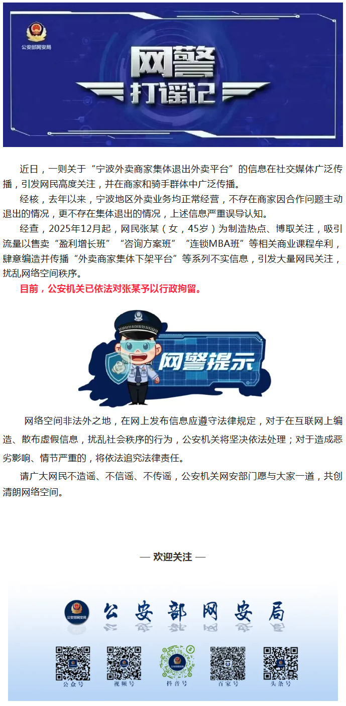 网警打谣记|散布“外卖商家集体下架平台”谣言博流量 主播张某被依法行政拘留