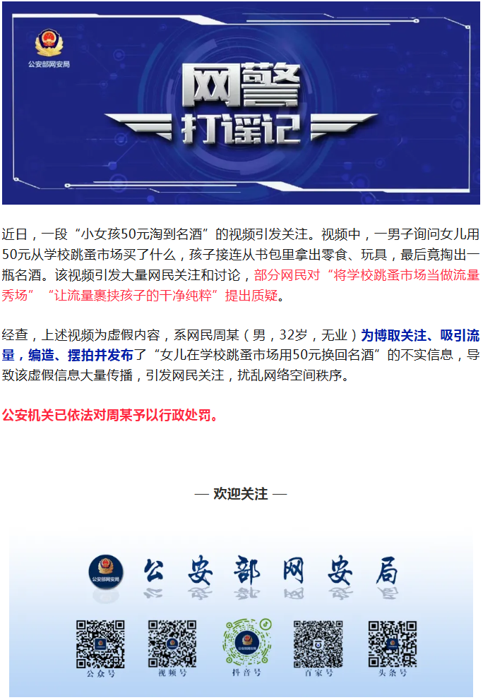 网警打谣记|周某摆拍造谣“女儿在学校跳蚤市场用50元换回名酒”被行政处罚!